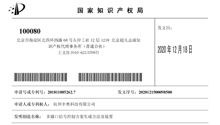 近日,杭州中奧科技有限公司獲得國家知識產權局頒發的《多路口信號控制方案生成方法及裝置》、《信號控制方案生成方法及裝置》和《城市區域分級劃分方法及裝置》三項發明專利授權證書,這些專利技術為智慧城市、智慧交通提供不斷創新的技術應用支撐。