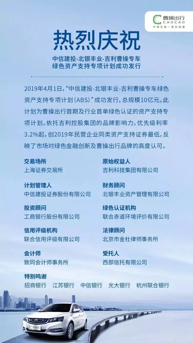 2019年4月1日,“中信建投-北銀豐業(yè)-吉利曹操專車綠色資產(chǎn)支持專項(xiàng)計(jì)劃(ABS)”成功發(fā)行,總規(guī)模10億元。此計(jì)劃為天堂硅谷投資項(xiàng)目曹操出行首期及行業(yè)首單綠色認(rèn)證的資產(chǎn)支持專項(xiàng)計(jì)劃。依托吉利控股集團(tuán)的品牌影響力,優(yōu)先級(jí)利率3.2%起,創(chuàng)2019年民營企業(yè)同類資產(chǎn)支持證券最低,反映了市場(chǎng)對(duì)綠色金融創(chuàng)新及曹操出行品牌的高度認(rèn)可。